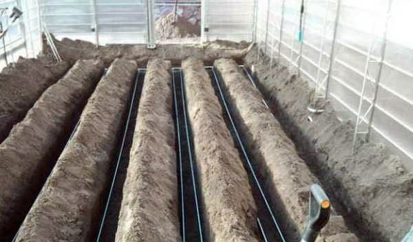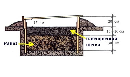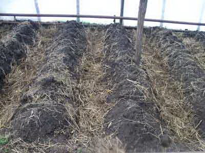Для создания грядок в теплице вынимается грунт на 30–40 см. На его место насыпается навоз слоем в 25–30 см, сверху которого слегка утрамбовывается пласт плодородной почвы в 15 см.