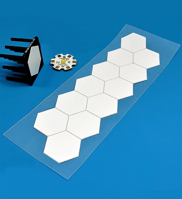 - Используя двухсторонний теплопроводящий скотч, закрепить светодиоды на радиаторной пластине.