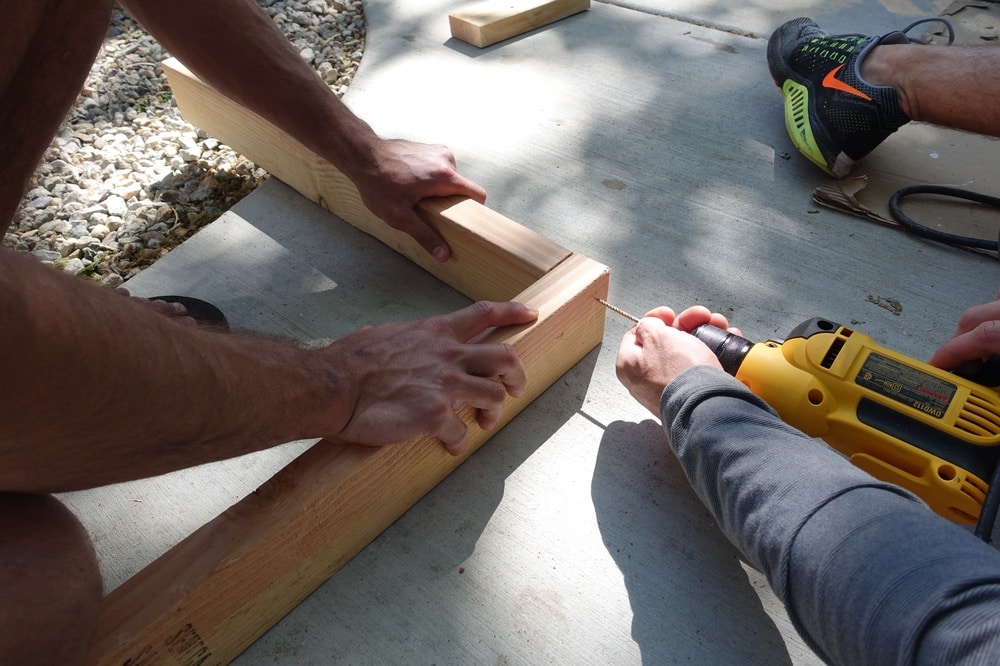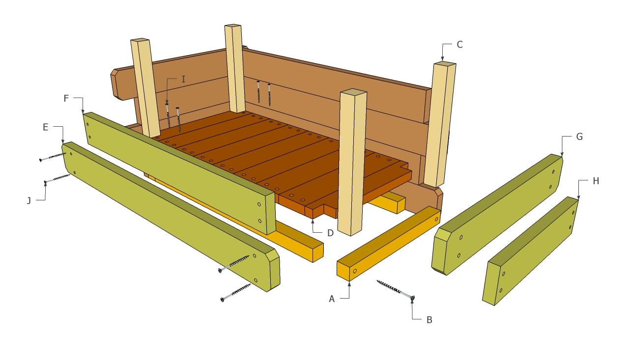 - Сборка основания. На каркас при помощи саморезов горизонтально монтируются доски. Фронтальная часть основания состоит всего из двух рядов. Чтобы добиться прочности в углах, один ряд должен выступать за пределы каркаса на 25 мм. Такие выпуски делаются на каждом из углов, чтобы скрепить стороны между собой.