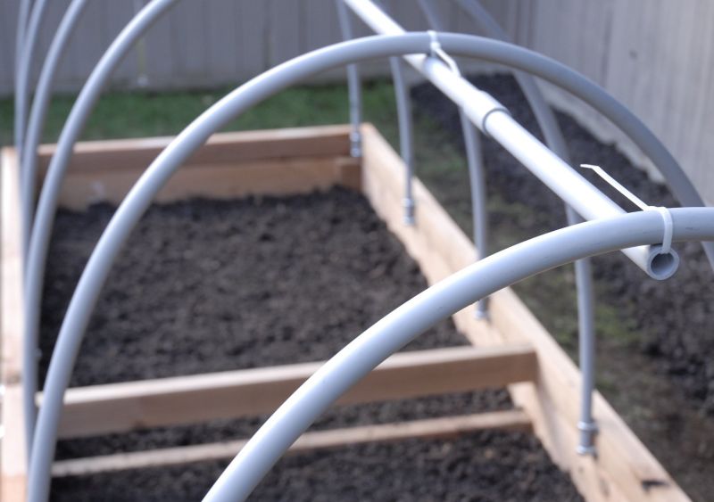 - Укрепите конструкцию поперечной трубой сверху. Для этого просверлите отверстия в местах перекрещивания труб и закрепите их при помощи арматурных хомутов. Поперечная труба располагается под арками.