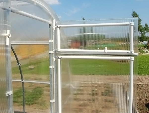 На этом этапе необходимо соорудить дверь и окно, которые будут частью вентиляционной системы. Изготовьте их для арочной теплицы своими руками из труб ПВХ – фото со схемами сборки, размещенные выше, помогут вам в этом. Сборку выполняйте на ровной поверхности и на каждом этапе контролируйте прямоугольность углов конструкции.