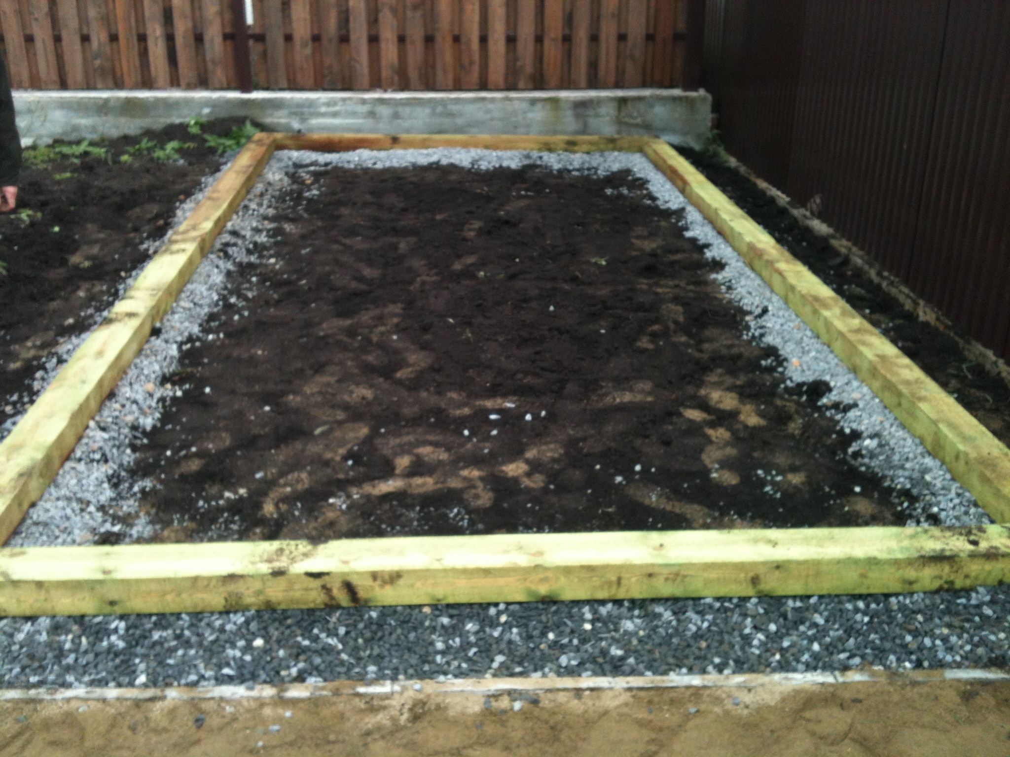 - Выемка грунта – выкопайте траншею глубиной 10–15 см, подсыпьте в нее и утрамбуйте песчаную смесь, образуя подушку, на 5–10 см превышающей уровень почвы.