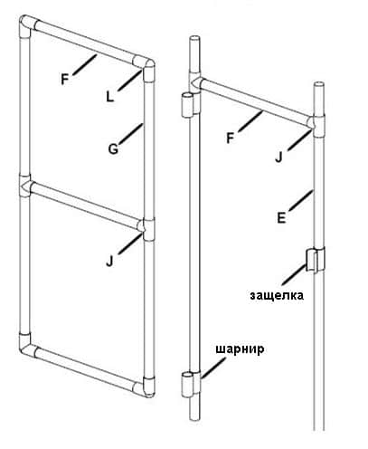 - На одну из оставшихся труб F натяните два шарнира, на другую – защелку.
