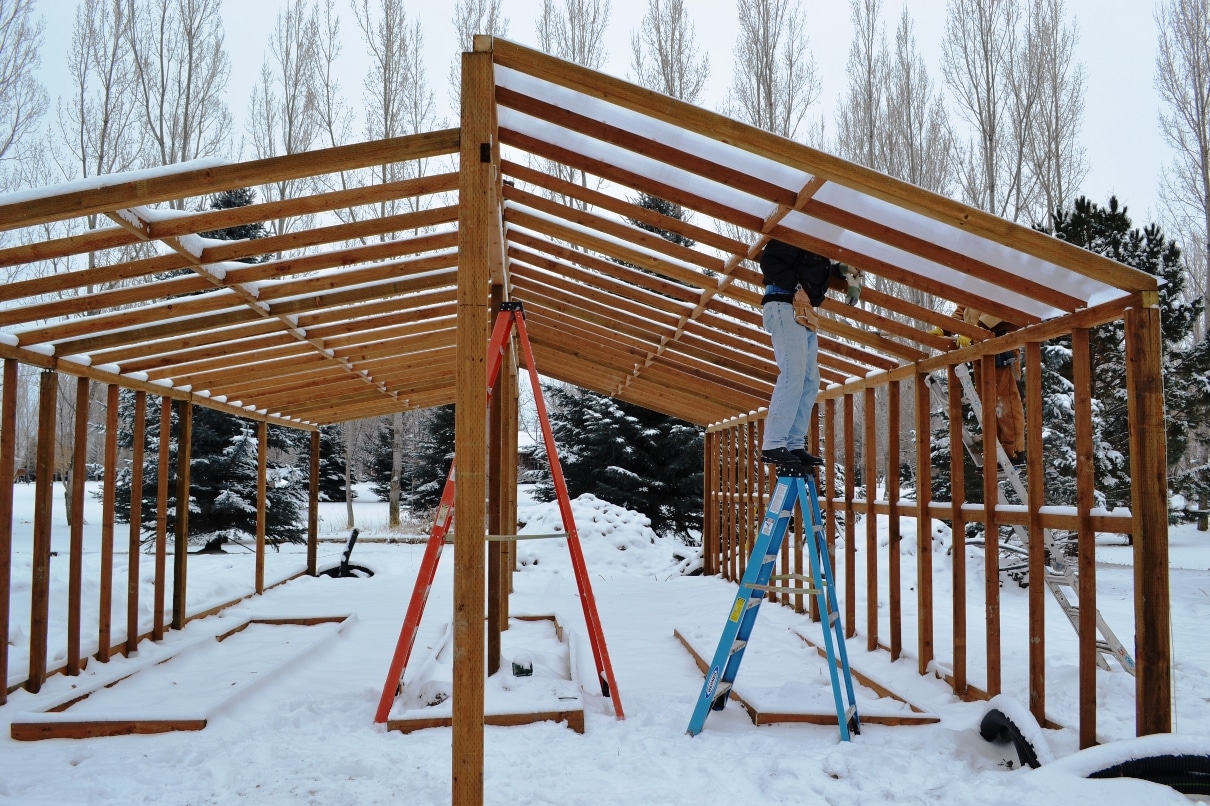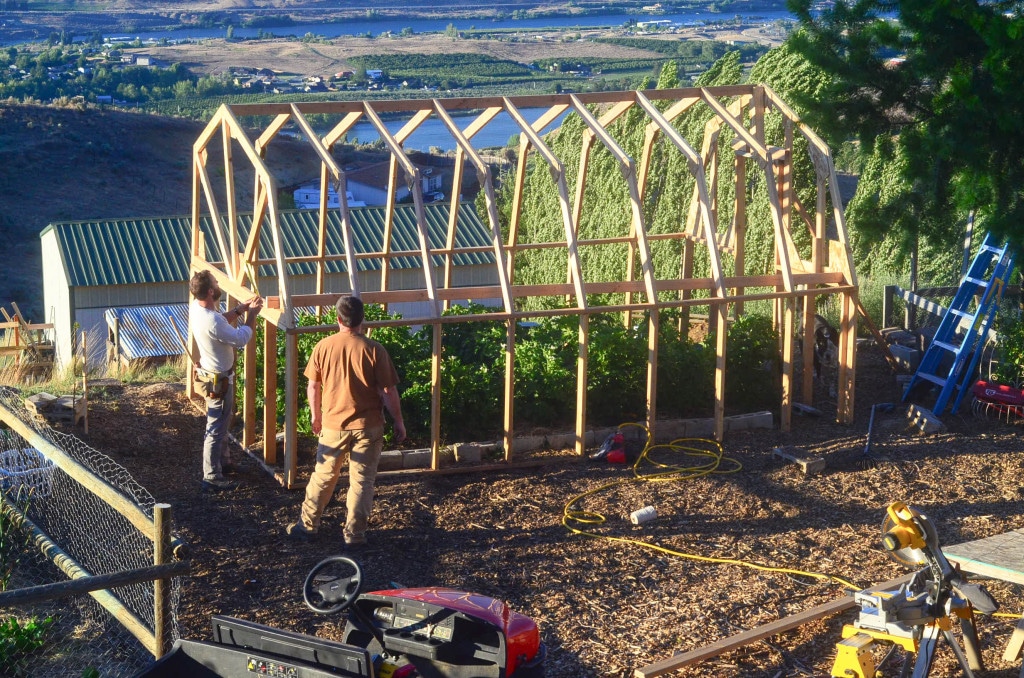 А на стыке двух половин кровли образуется свободное пространство, куда отлично вписываются фрамуги для вентиляции. Конструкция может быть арочной или двускатной с вертикальными стенами. В обоих случаях, вентиляцию обеспечить очень просто. Каркас традиционно делают из дерева.
