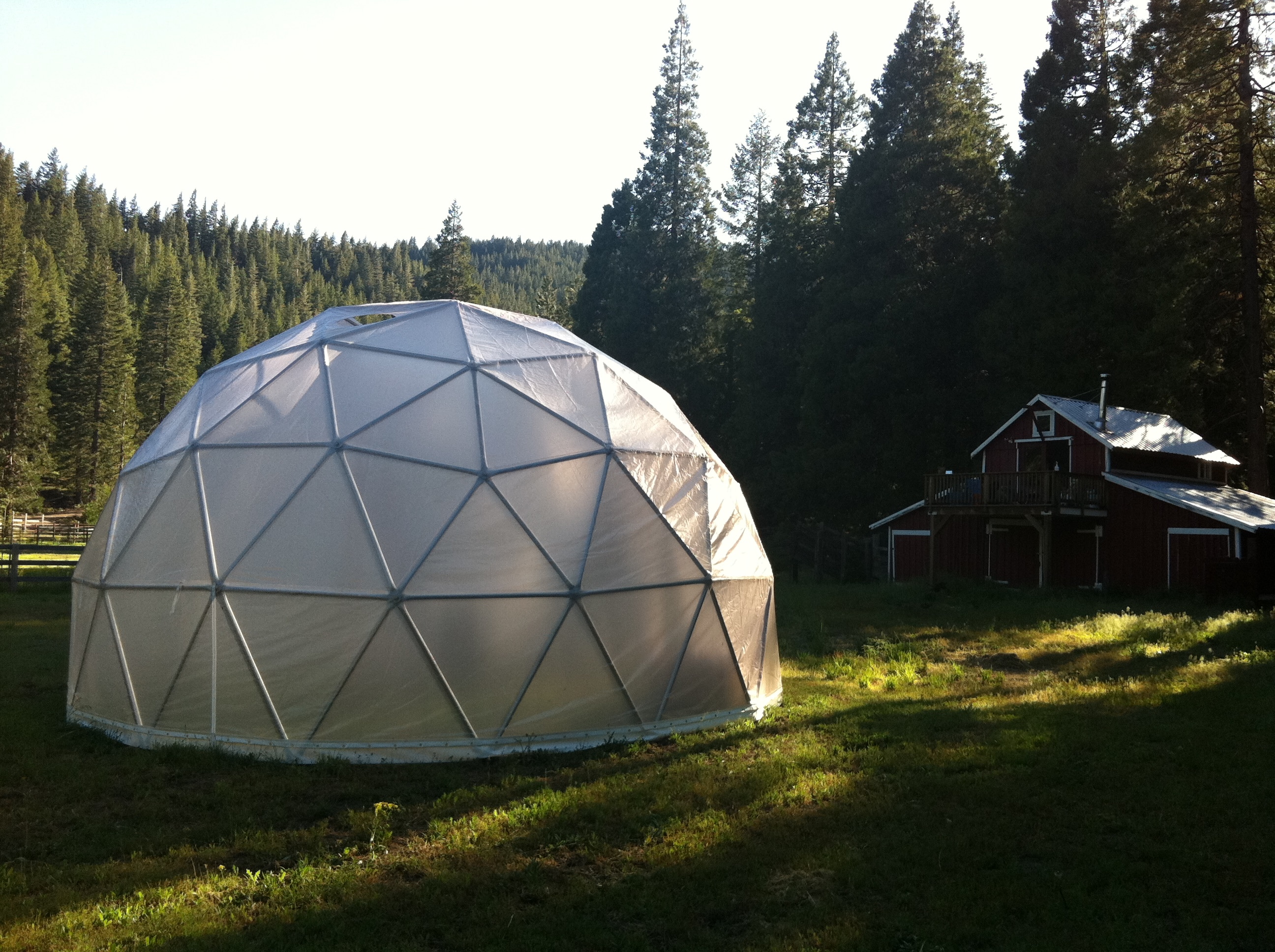 Теплица оригинальной сферической формы смотрится на участке очень необычно. Сама конструкция уже является украшением сада и может служить ярким элементом ландшафтного дизайна. Купол парника собирается, как конструктор из треугольных элементов. Примечательно то, что покрытие является самонесущим и не требует никаких опор или каркасов, в том числе – фундамента.