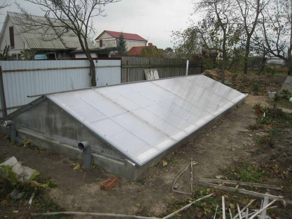 Известно, что зимой земля промерзает медленно. При температуре воздуха ±1°С, температура почвы на глубине 1 метр составляет около 10°С. В устройстве теплицы нельзя не воспользоваться таким природным бонусом. Для строительства нужно предварительно вырыть яму, глубиной от 1 до 1,5 м, а сверху установить прозрачное покрытие.