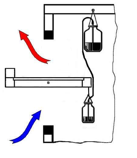 Две банки разной емкости (800 мл и 3 л) наполняются водой и размещаются таким образом, чтобы при нагреве они могли перемещаться и тянуть рычаг, прикрепленный к форточке (принцип работает только для фрамуг с горизонтальной осью по центру). Процесс сборки выглядит так: