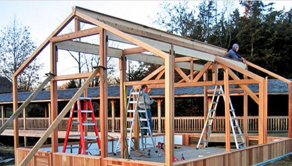 Верхнюю обвязку (брус 50х50) необходимо надежно прикрепить к стойкам саморезами и уголками, которые были заблаговременно привинчены на верстаке. Для придания конструкции жесткости стойки требуется связать продольной обрешеткой из досок. После этого на земле нужно собрать простейшую стропильную ферму: