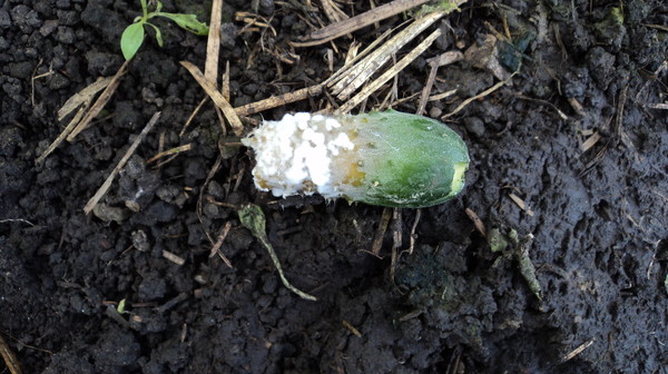 Иногда в загущенных посадках на огурцах можно заметить серые склизкие пятна – это распространяется серая гниль. Плохая вентиляция теплицы, чрезмерный полив, холодная вода провоцирует болезнь. Обнаружив такие пятна на одном растении, необходимо проверить все остальные, обработать либо удалить зараженные и отрегулировать влажность воздуха. Лечение серой гнили заключается в присыпании пораженных мест смесью медного купороса и древесной золы (1 ч. л. к 1 ст.).