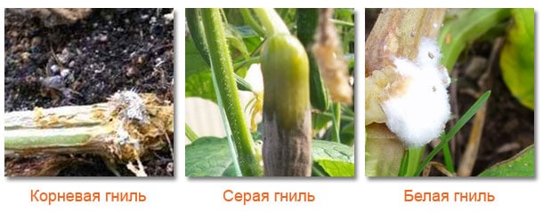 Как и мучнистая роса, гнили – болезни огурцов в теплице, которые вызываются грибками. Различают виды гнилей: белая, серая, корневая. Симптомом заражения огурцов корневой гнилью является пожелтение и увядание листьев, при этом стебель у корня растрескивается и желтеет. Высаживая рассаду в теплицу, рекомендуется не углублять в грунт стебель, не окучивать его, не присыпать почвой – так можно уберечь кусты от болезни.
