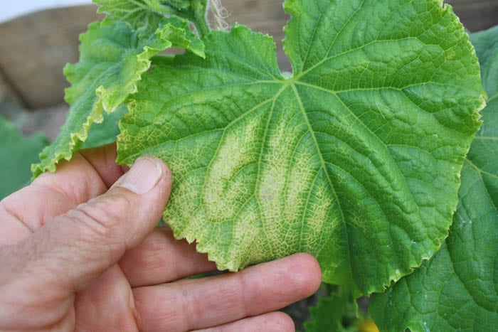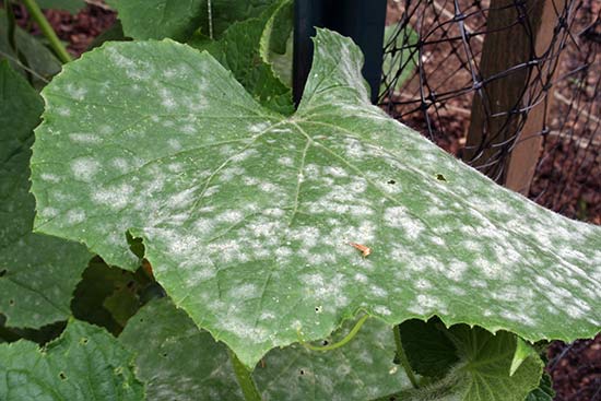 Болезнь проявляется как беловато-сероватое напыление на внешней стороне настоящих листьев огуречных плетей (пятна на вид как припыленные мукой), потом беловатый оттенок появляется на тыльной стороне листовой пластины. Куст усыхает и гибнет.