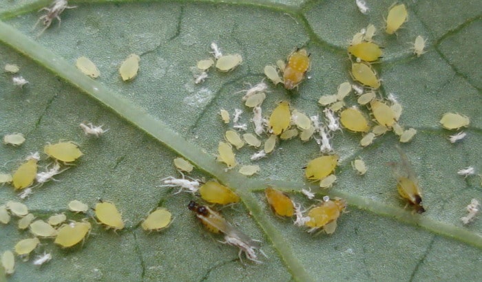Понять, что на огурцы «напала» тля довольно просто. Первый симптом – это увядание растения и засыхание листьев. Тля на огурцах в теплице размножается на тыльной стороне листовой пластины: при заражении этим вредителем низ листа просто усеян личинками и взрослыми особями. Паразитируя на огуречной лозе, высасывая питательные вещества, тля не дает плодам нормально развиваться и плодоносить, сроки плодоношения значительно сдвигаются и урожай не успевает вызревать.