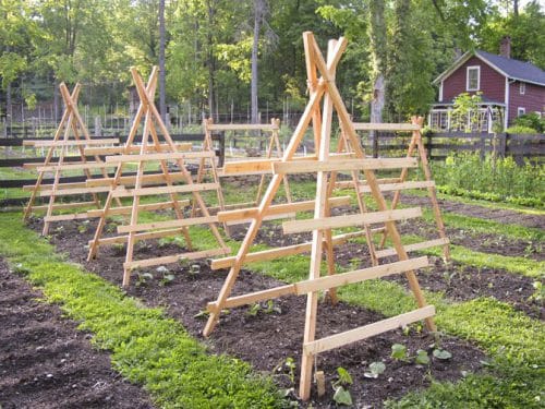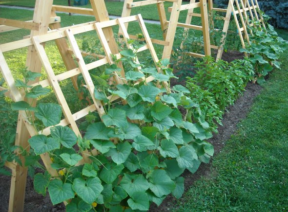Для подвязки огурцов используют так называемые шпалеры. Расстановка опорных стоек тем или иным образом позволяет получить конструкцию прямоугольной, квадратной и даже пирамидальной формы. Пространство между стойками заполняют поперечинами, вертикальными направляющими или специальной полимерной сеткой.