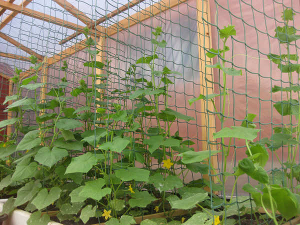 Собственно, в этом заключается основной недостаток такого варианта подвязки огурцов. Нередко побеги начинают обвивать первую поперечину, вместо того, чтобы тянутся вверх – к следующей из них. При этом образуются настоящие клубки из усов и листьев. Искать в них плоды неудобно. По этой причине горизонтальные опоры нередко комбинируют с вертикальными.