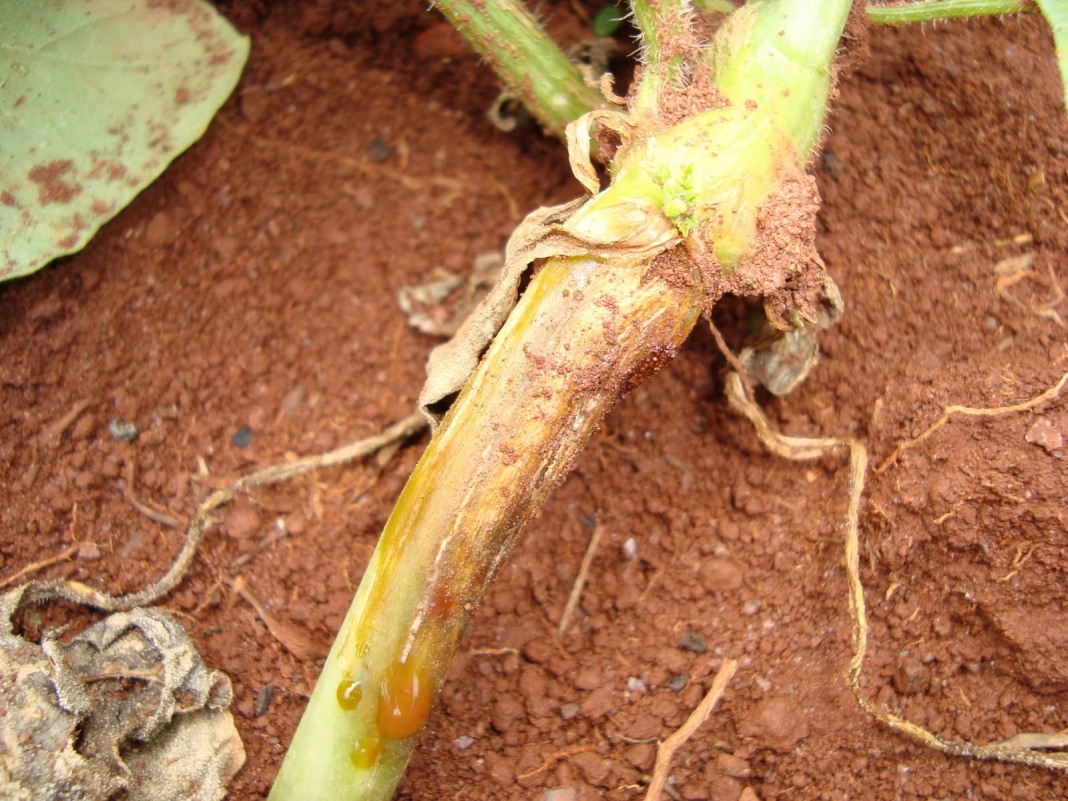 Это довольно вредоносная болезнь: повреждаются все части плодоносящих растений. В незащищенном грунте она встречается редко, более характерна для теплиц. Начинается заболевание со стеблей, где возникают зеленоватые округлые пятна, которые быстро разрастаются, охватывая стебель целиком. Ткани стебля мокнут, разрыхляются, на поверхности появляются коричневые (иногда молочного цвета) капельки.