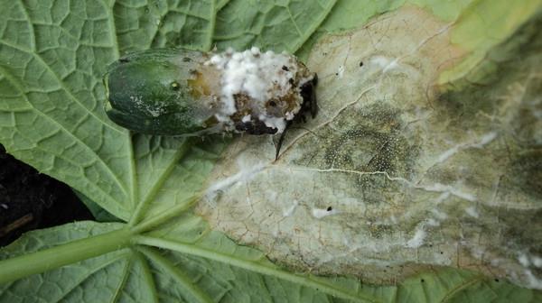 Далее следует образование белых пятен на верхней стороне листов. Позже пятна сливаются, образуя сплошной белесый налет. Мучнистый налет снизу продолжает стремительно развиваться, переходя на черешки и стебли. Растения обезвоживаются, плодов образуется все меньше, а те, что есть, мельчают, становятся горькими. В итоге культуры гибнут.