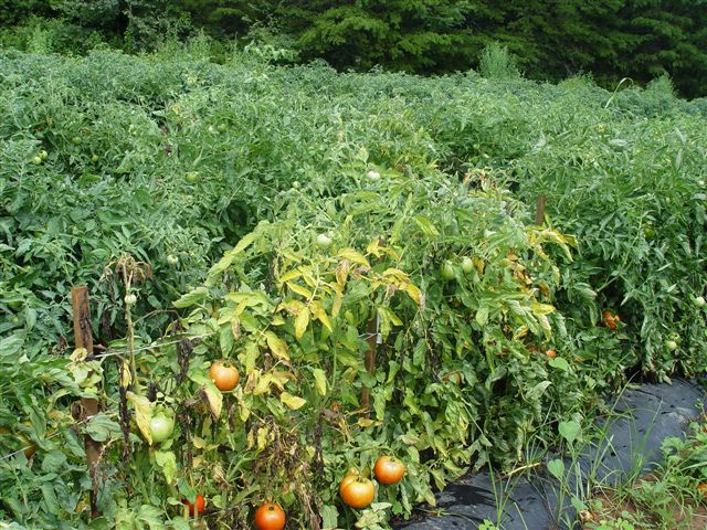 Первые симптомы заболевания томатов появляются на стареющих листьях, которые в жару увядают.
