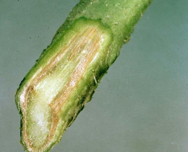 В активной фазе некроз сосудов достигает длины одного и более метров (к примеру, при корневой гнили некрозы не превышают расстояния 15 см), на срезе стебля можно наблюдать темное кольцо пораженных сосудов, растение увядает. Есть сходство этого заболевания с фузариозным увяданием, отличие в проявлении одностороннего хлороза листьев, потерей ими тургора.