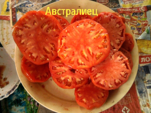 Ишимцева Лидия Иосифовна (Челябинская область) вывела томат «Австралиец» – высокорослый среднеспелый сорт. Плоды имеют универсальное назначение. Форма округлая, слегка сплюснутая. Окраска медово-красная. Мякоть сочная. Средний вес томата 600 г. Урожайность сорта высокая. Растения достигают 1,5 м. Австралиец устойчив к основным заболеваниям, помидоры имеют великолепный вкус и аромат.