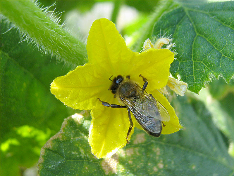 Единичные залетевшие насекомые не в состоянии посетить все цветки. Как вариант, можно разместить в сооружении улей, однако теплица должна иметь значительные размеры, чтобы обеспечить пищей тысячи пчел.
