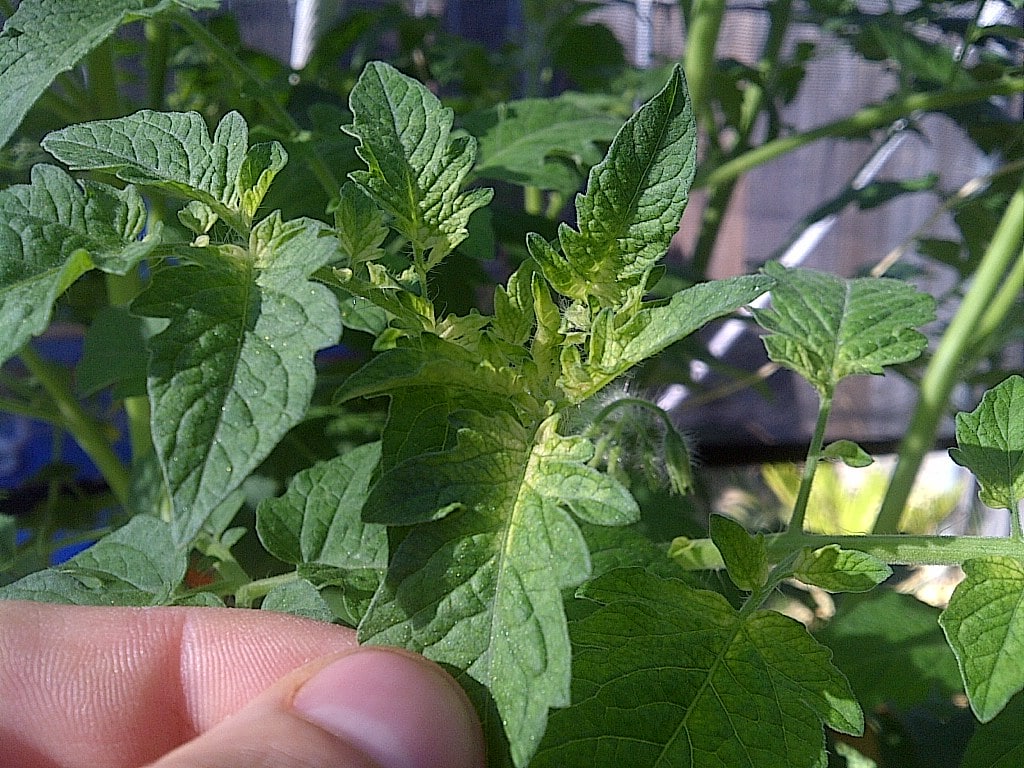 Внесение железного купороса: 5 г купороса тщательно растворить в 1 л теплой дистиллированной воды, дать отстояться, а потом процедить. Это необходимо для того, чтобы предотвратить попадание кристаллов на листья. Полученной смесью опрыскать помидоры.