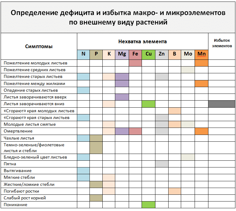 Нехватка питательных веществ весьма пагубно отражается на развитии огурцов и их плодоношении. Не лучшим образом влияет и избыток некоторых элементов питания. Как узнать, чего недостает в рационе растений, а что в избытке? Листья, стебли, плоды огурцов сами поведают об этом, нужно только суметь их понять. Признаки дефицита и избытка отдельных элементов перечислены в приведенной ниже таблице.