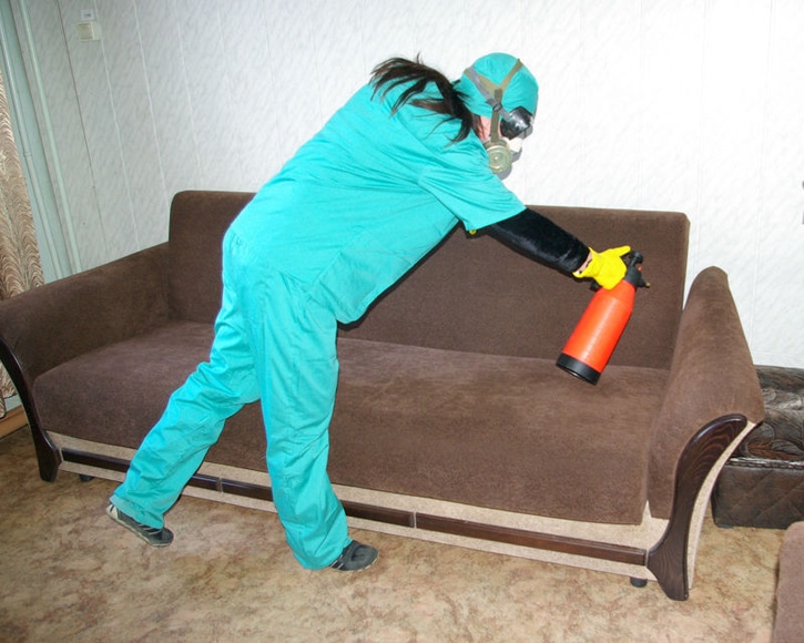 - Обработку поверхностей лучше выполнять кистью. Для начала наносят пестицид на обратные стороны ковров, порогов и облицовочных панелей, после чего переходят к предметам мебели и вентиляции. Важно не забыть о мягкой мебели и всевозможнейших стыках и зазорах.