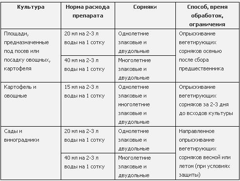 В инструкции к гербициду вы найдете рекомендуемые нормы его разведения и расхода для различных целей. Так, для борьбы с многолетними сорняками на участке, предназначенном под газон, понадобится раствор в концентрации 90 мл средства на 10 литров воды.