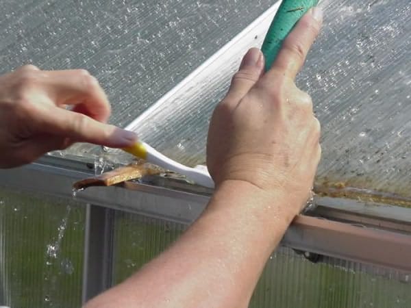 Корпус теплицы из поликарбоната имеет небольшое количество арматурных элементов из металла. 90% поверхности – это, собственно, пластик, на котором нем могут находиться приклеившиеся листья растений, наслоения пыли и почвы, в которых могут сохраняться споры болезнетворных грибов или яйца насекомых-паразитов.
